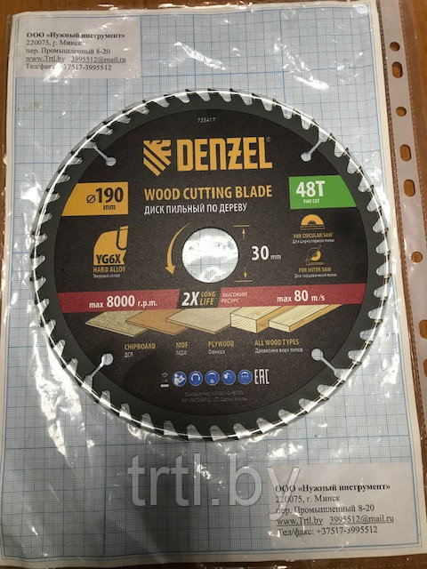 Показать оптовые ценыДиск пильный 190х30мм Z48 тверд.зуб. по дереву DENZEL код 1.18895